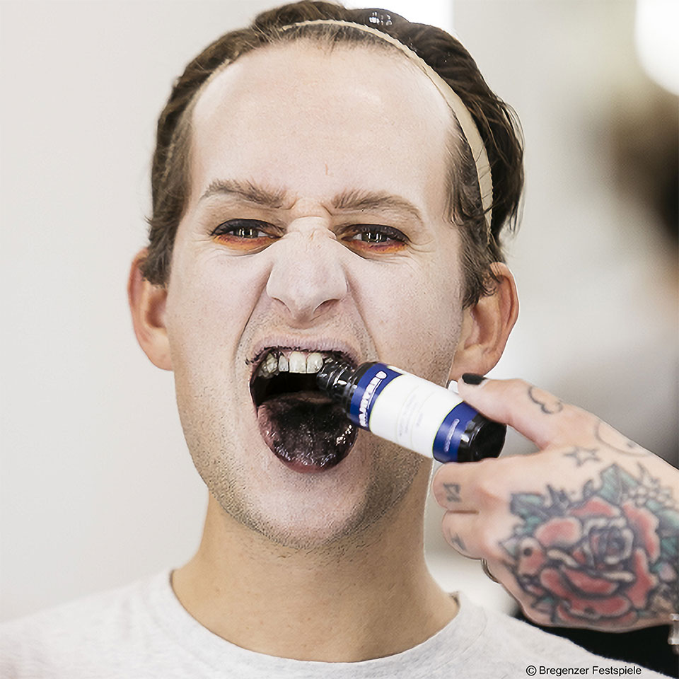 Zungenfarbe ist eine stark färbende, geschmacksneutrale, wässrige Lösung zur Anwendung im Mundraum. Sie färbt die Schleimhäute und die Zunge intensiv ein und sorgt – je nach Farbton – für dramatische Effekte, von krankheitsähnlichen Erscheinungen bis hin zu surrealen Verfärbungen. Die Haltbarkeit variiert je nach Speichelfluss und individuellen Faktoren zwischen 30 Minuten und mehreren Stunden. Bei Bedarf kann die Intensität der Färbung jederzeit verstärkt werden.
